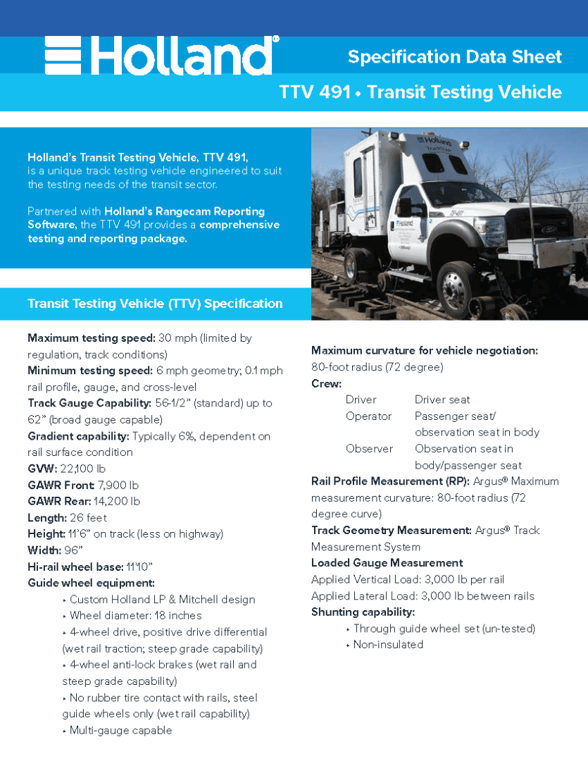 Our largest testing vehicle, the 400 Series, provides track geometry and rail profile measurement data along with track strength information from our proprietary load ...